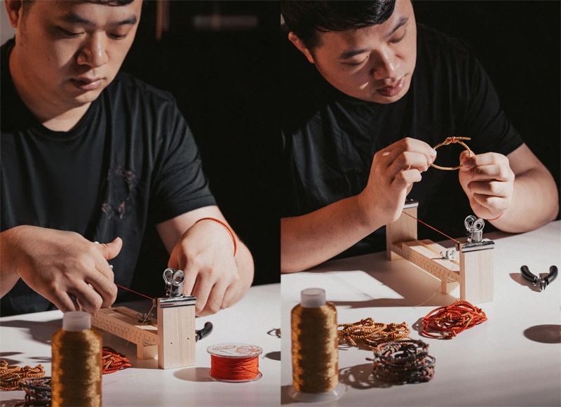 “将欢喜与好运融入每一件绳编设计中。以现代审美重新诠释每个喜庆时刻、每份美好祈愿”在研究技艺的同时,曹吉昌深入探究绳编文化的精髓。他广泛搜集结绳相关的文物与文献,细致研究每种结绳背后的深层含义,不仅成功复原了众多古老的结绳技法,更深刻领悟到了绳编所蕴含的丰富文化内涵及其背后的文化寓意。这份深刻的理解,使他对绳编艺术愈发痴迷。他常向学生们强调:“绳编不仅是技艺的展现,更是知识的传承。每一个绳结,都是祖先智慧的结晶,蕴含着吉祥的寓意与对生活的美好祝愿。我期望每一位佩戴心喜首饰的人,都能因得到“心喜”吉物加持而更加自信、自足、积极和喜悦。”
